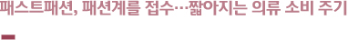 보통 치약, 샴푸와 같은 생활용품을 FMCG(Fast moving consumer goods)라고 부른다고 한다. FMCG는 쓰고 없어지면 다시 사서 쓰는 상품들로 이해하면 된다. 최근 생활용품, 화장품 등 소모성 제품을 일컫는 말인 FMCG의 영역이 의류, 음악, 가구로 확장되고 있다. 요즘 사람들은 한번 사면 두고두고 쓰지 않는다. 아직 사용할 만 하지만 새로운 것으로 대체한다. 예전처럼 3~4년 넘게 입을 목적으로 큰 맘 먹고, 옷 한 벌 사는 사람들도 줄고 있다. 유행하는 음악 1곡을 몇 개월 동안 듣고 또 들으면서, 진중하게 음악을 감상하는 사람들도 줄고 있다. 집안 인테리어에 도움이 되지 않는다면, 미안하지만 몇 달 전 산 물건이더라도 아파트 쓰레기 분리수거 날에 내다버린다. 바로 빠른 소비의 일면이다. 빠른 소비는 싫증을 잘 내며 트렌드를 추종하고 합리적인 소비를 선호하는 젊은 소비자들 사이에서 눈에 띄게 늘고 있다.